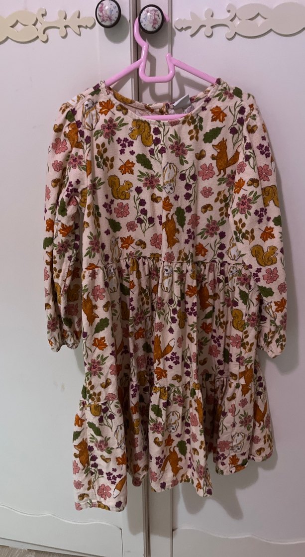 Kız çocuk elbise, uzun kollu ve bol kesimdir. Çok renkli pastel baskılı, yuvarlak yakalı ve fırfır detaylıdır. Bohem tarzındadır.