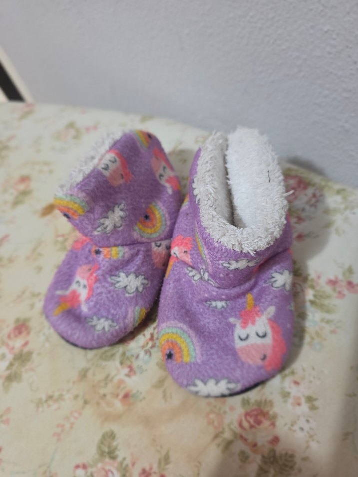 Kız çocukları için bohem tarzda, yumuşak ve sıcak kumaşlı, örgü yapıda renkli mor ev terliği. Üzerinde unicorn ve gökkuşağı desenleri bulunur.
