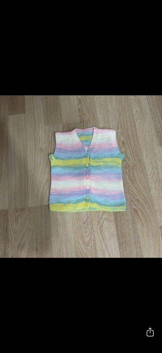 Kız çocuklar için gevşek kesim, kolsuz, pastel çok renkli batik desenli örgü yelek. V yaka ve düğmeli kapamalı bohem tarzda.