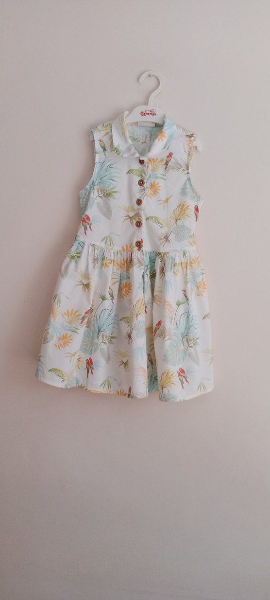 Kolsuz, bol kesim kız çocuk elbisesi. Pastel tonlarda batik desenli, fırfır detaylı ve V yakalıdır. Bohem ve retro tarzda, sentetik kumaştan yapılmıştır.