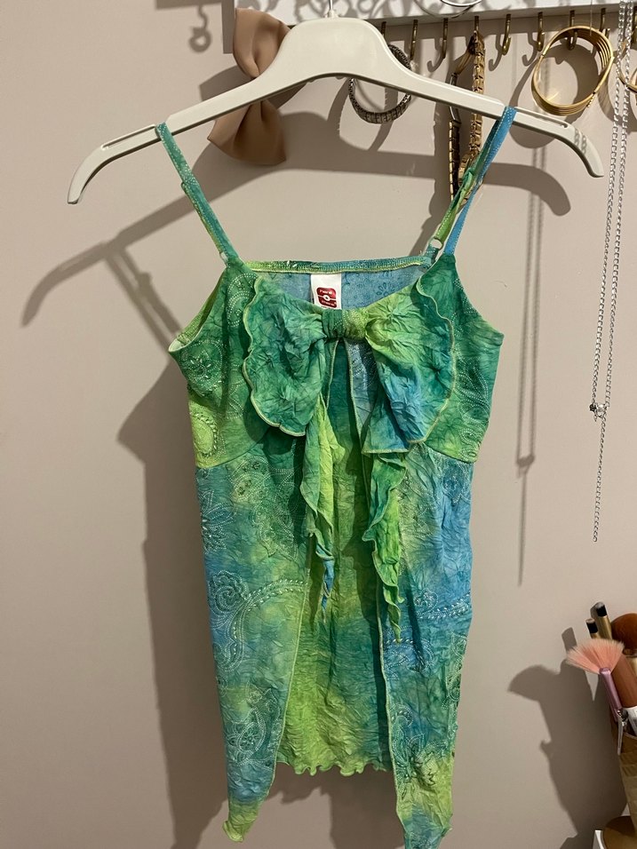 Çocuk üstü ama XS S BEDEN UYUMLU yumuşak keten kumaştan yapılmış, bohem tarzda, fırfırlı ve halter yakalı, yeşil pastel batik desenli kolsuz dar kesim kız çocuk üstü.