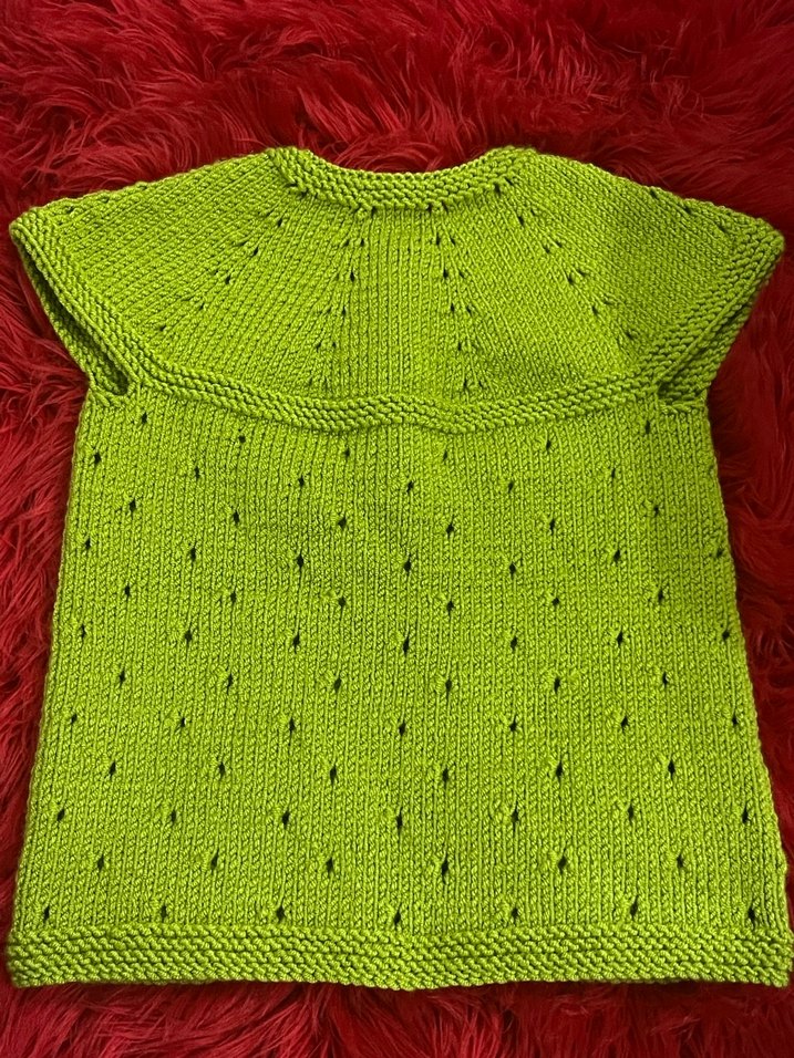 Kolsuz, yeşil renkte bebek triko hırka, bol kesim ve yuvarlak yaka ile sade bohem tarzda tasarlanmıştır. Düğmesi eklenir.