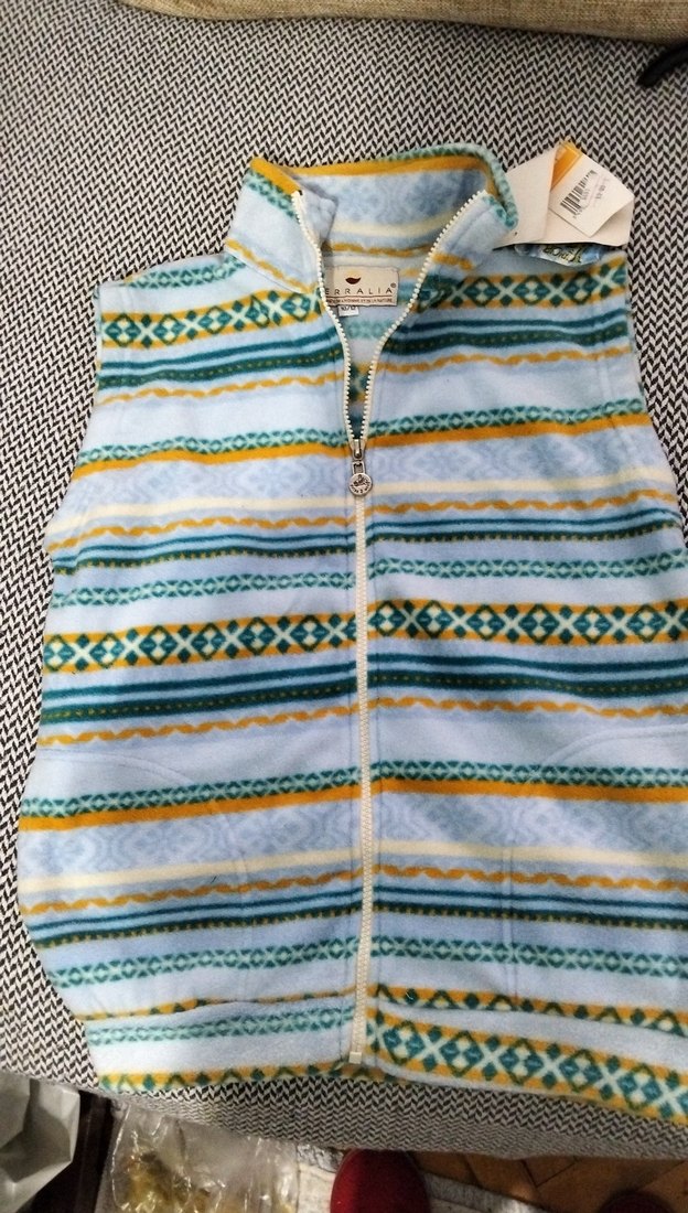 Kız çocukları için yüksek yakalı, fermuarlı ve kolsuz yelek. Yumuşak, sıcak kumaştan ve pastel çok renkli bohem desenlerle tasarlanmıştır. polar. boy 60.göğüs 48