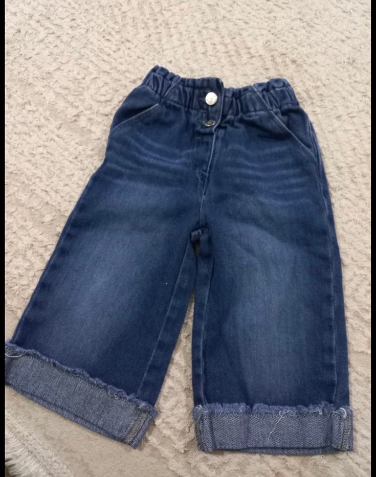 Kız çocuklar için düğmeli, bol kesim mavi kot pantolon. Katlanmış paçalarla rahat ve trend bir görünüm sağlar.