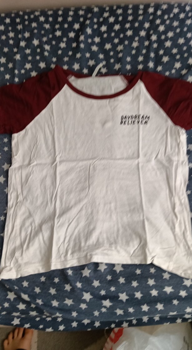Kız çocuk tişörtü, kısa kollu ve yuvarlak yakalıdır. Pamuk kumaştan üretilmiş, baskılı desene sahip ve bol kesimdir. Beyaz gövde ile koyu bordo kollara sahiptir.