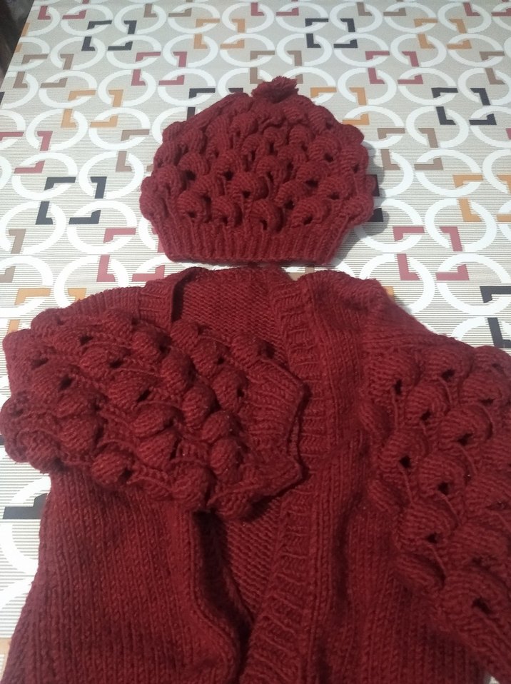 Bordo renkte, bohem tarzda, örgü desenli, bol kesim uzun kollu kız çocuk hırka ve uyumlu bere takımı. el örgüsü