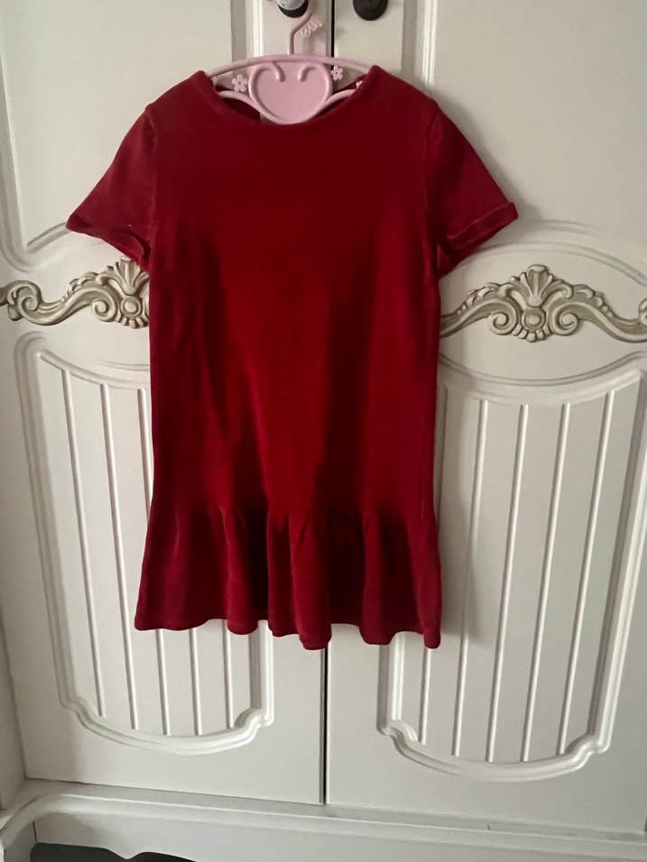 Bordo, kısa kollu, yuvarlak yakalı ve bol kesimli kız çocuk elbisesi, etek kısmında fırfır detayı bulunur.