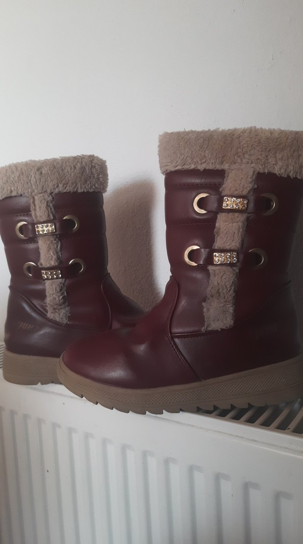 Kız çocukları için bordı deri botlar, üst kısmında kürk detayları ve dekoratif kayışlara sahiptir. Rahat tabanlı, günlük sokak stiline uygun.