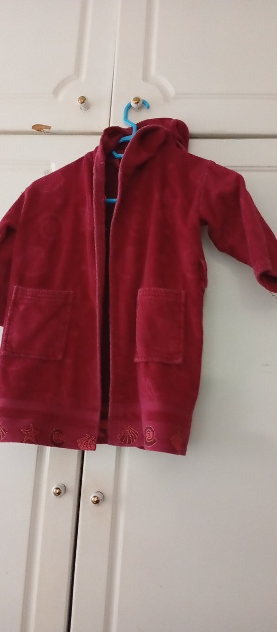Bordo renkli kız çocuk bornozu, yumuşak ve sıcak kumaştan olup, etek kısmında nakış desenleri ve iki ön cep bulunur.