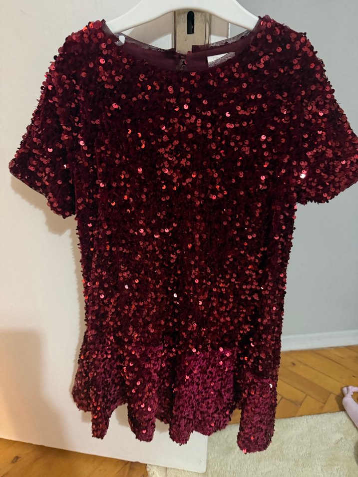 Bordo renkli, kısa kollu ve yuvarlak yakalı kız çocuk elbisesi, sentetik kumaştan üretilmiş ve bol kesimdir. Parlak payetlerle süslenmiştir. ✨ yeni yıl için muhteşem 2 kez giyildi yeniden farksız.