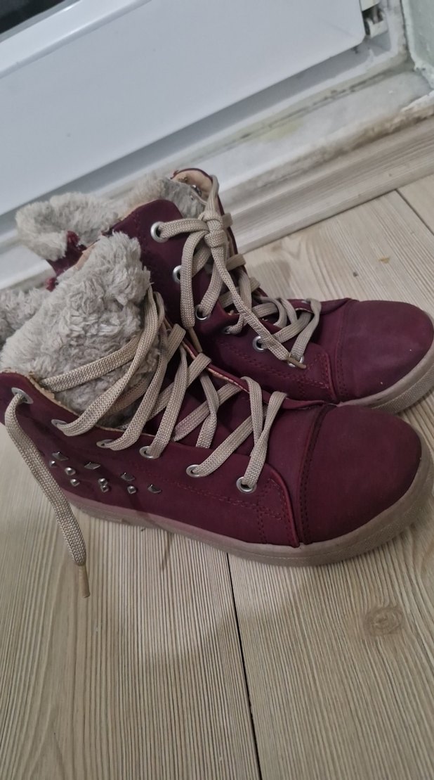 Bordo süet kız çocuk botları, kürk detaylı ve gri bağcıklı, bohem tarzda. Rahat ve sıcak tutar.