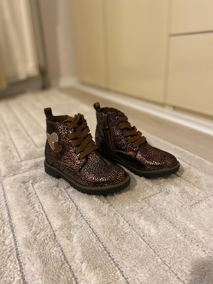 Kız çocukları için kahverengi yılan desenli deri botlar, kürk detaylı, trend sokak stili ve rahatlığı bir arada sunar.