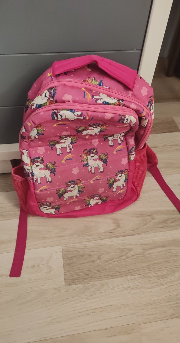 2 gözü olan büyük gözünde ekstra bir gözü daha olan iki suluk koyma alanına sahip hafif hasarlı pembe unicornlu temalı kız çocuk çantası