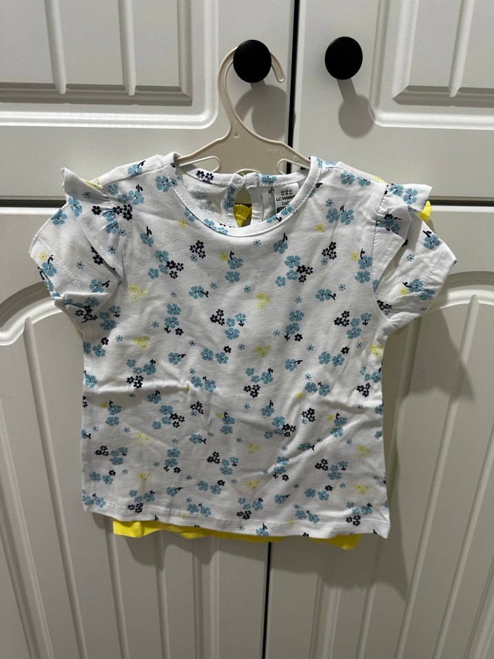 Pamuklu, kısa kollu ve fırfırlı kız çocuk tişörtü. Beyaz zemin üzerine gri ve mavi çiçek baskılı, dar kesim ve yuvarlak yakalı.