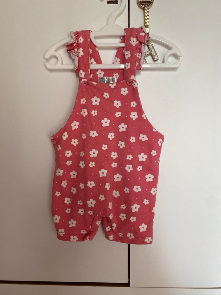 Pembe renkli, askılı ve bol kesim kız çocuk tulumu, beyaz çiçek desenli ve ayarlanabilir tokalı askılara sahip. Sokak stili için uygun.