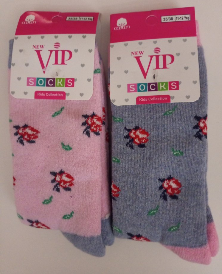 Pembe ve gri renklerde, çiçek desenli kız çocuk çorabı 2'li paket, yumuşak sentetik havlu kumaştan üretilmiştir. VIP Socks markalı. 11-12 yaş
