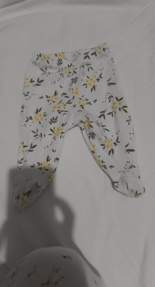 Beyaz zemin üzerine çiçek desenli, dantelli kız çocuk pantolonu. Yumuşak sentetik kumaştan, rahat ve salaş kesim.