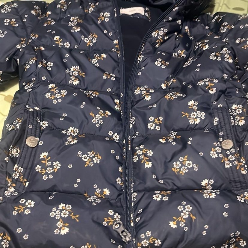 Dar kesim kız çocuk montu, çentikli yaka ve fermuarlı. Koyu gri sentetik kumaş üzerine çiçek deseniyle trend görünüme uygun.