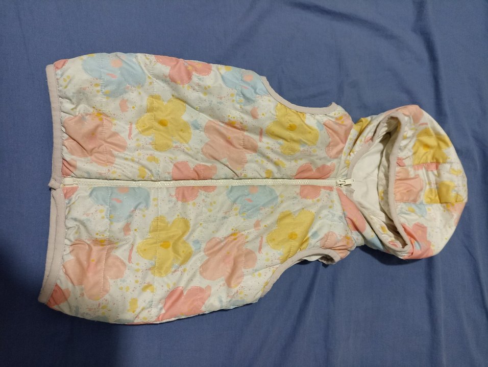 Fermuarlı, askısız yaka ve kolsuz tasarıma sahip, pastel tonlarda çiçek desenli kız çocuk yeleği. Yumuşak sentetik kumaştan üretilmiş, bohem ve retro stilini yansıtıyor.