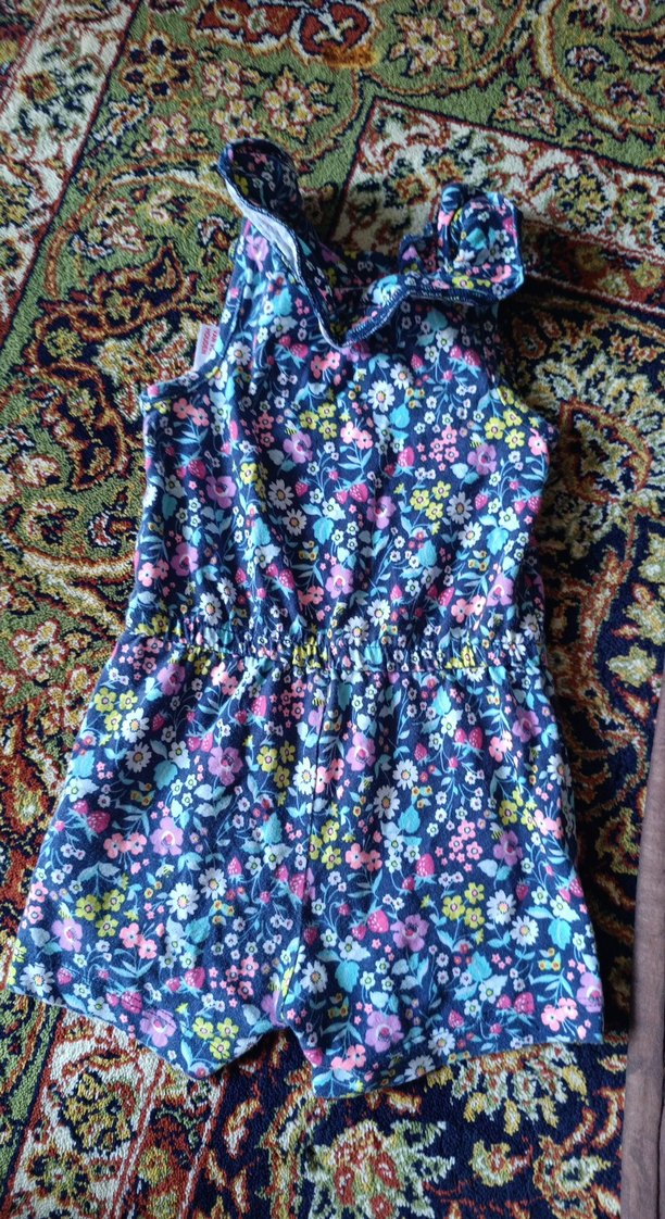 Kolsuz, renkli çiçek desenli kız çocuk tulumu. Yumuşak sentetik kumaştan, bol kesim ve bohem tarzda, fırfır detaylı.