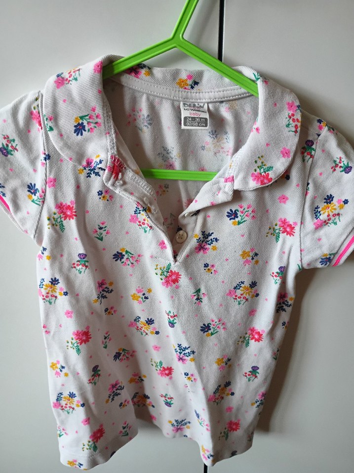 Kız çocuk gömlek, yakalı, kısa kollu ve düğmeli. Pamuklu, bol kesim, pastel beyaz zemin üzerine renkli çiçek desenli, trend sokak stili için uygun.