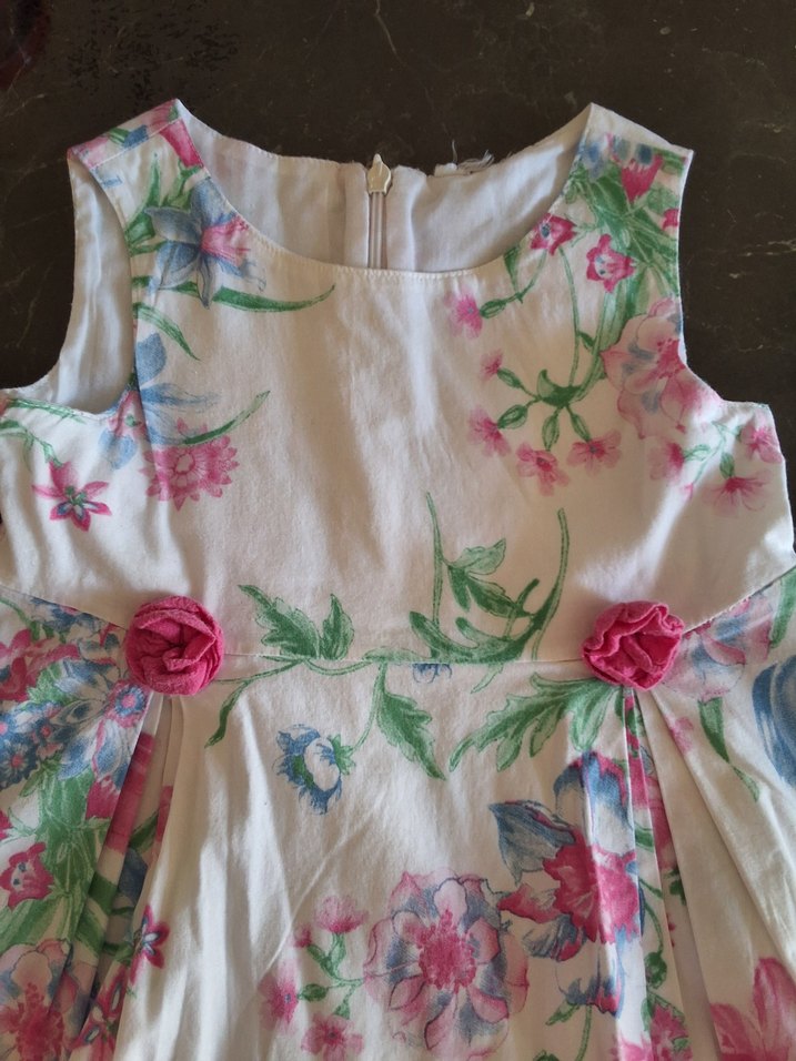 Kolsuz, kız çocuk elbisesi, pembe çiçek desenli ve pile detaylıdır. Kolsuz ve astarlı çok giyilmedi. Markayı kestiğim için tam hatırlamıyorum civil h&m de olabilir.