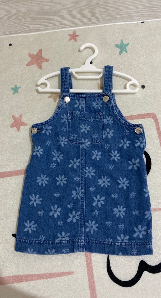 Kız çocukları için askılı, oturan kesim kot salopet. Çiçek desenli ve tokalı askılarıyla renkli bir görünüm sunar.
