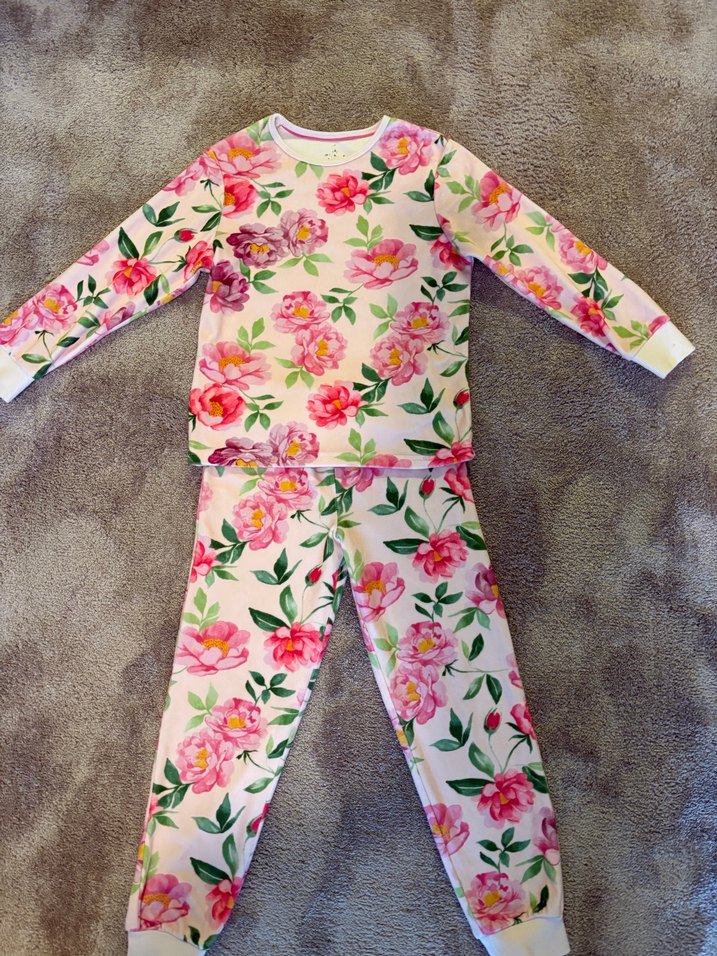 Uzun kollu, yuvarlak yakalı kız çocuk pijama takımı, yumuşak ve sıcak kumaştan. "Mükemmel durumda, çok az kullanılmış, birkaç kez giyilmiş; günlük takım olarak kullanılabilir."