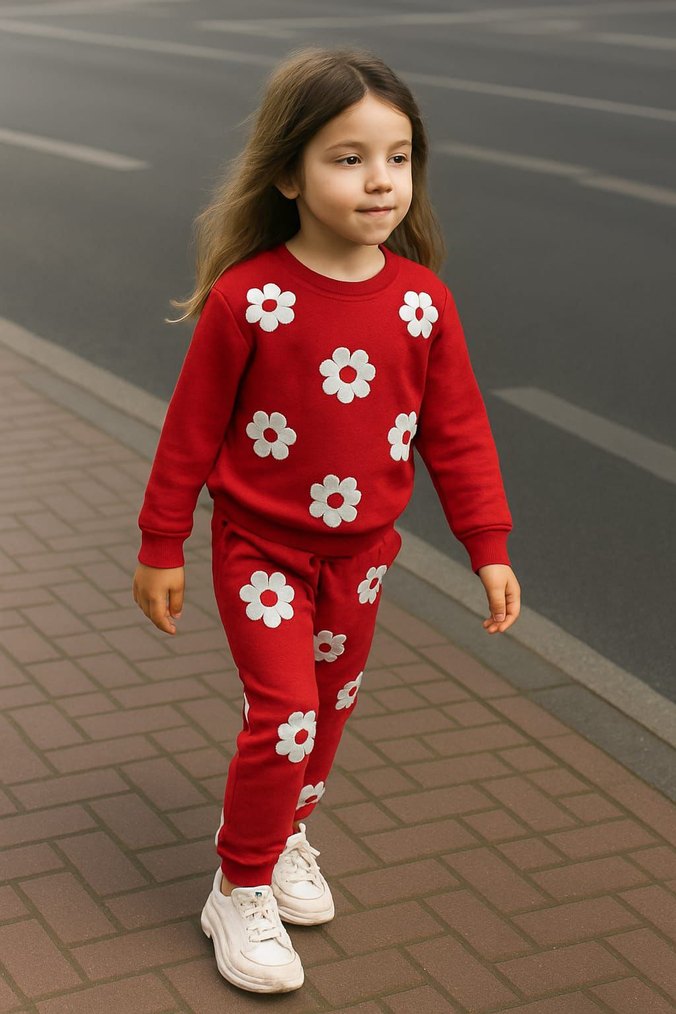 Kırmızı renkli, çiçek desenli kız çocuk takımı, 4/12 yaş beşli seri şardonlu dejenere iki iplik .yaş ve renk sorun