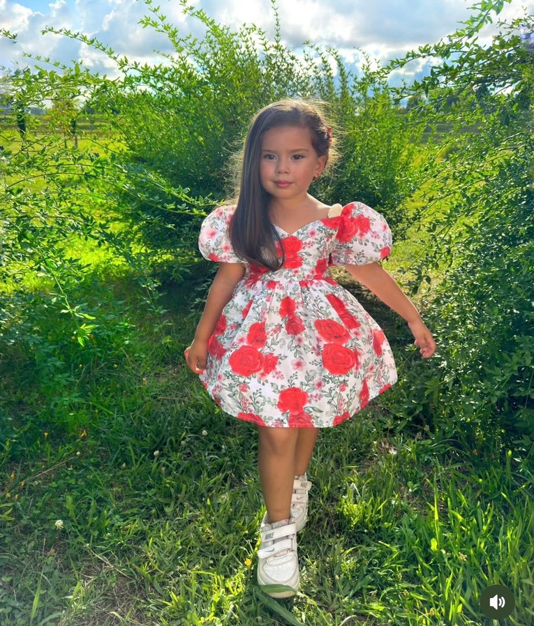 Renkli çiçek desenli, kısa kabarık kollu, dantel detaylı kız çocuk elbisesi. Yumuşak sentetik kumaştan, bol kesim ve straplez yakalıdır.