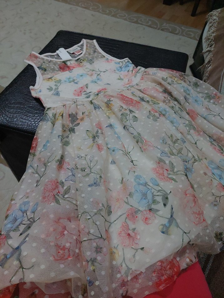 Beyaz zemin üzerine pastel çiçek desenli, straplez yaka ve dantelli, kolsuz, bohem tarzda kız çocuk elbisesi.