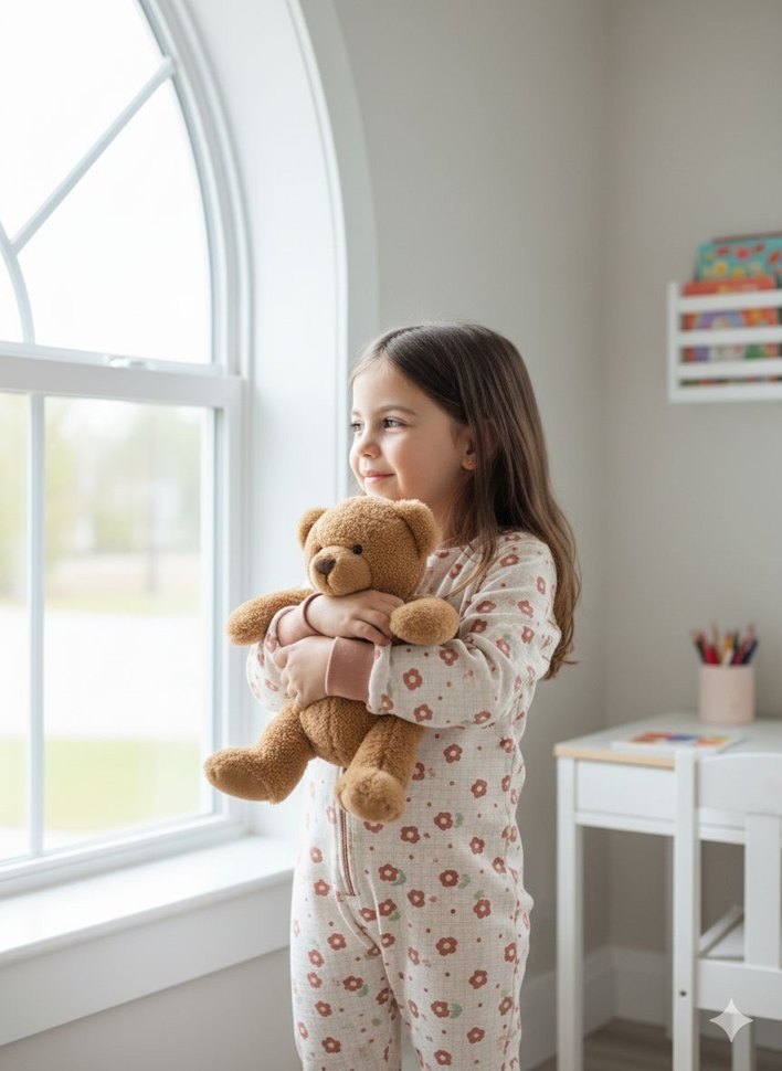 Kız çocukları için uzun kollu, yuvarlak yakalı, yumuşak ve sıcak kumaştan yapılmış, kabarık tasarımlı, pastel kahverengi leopar desenli pijama.
