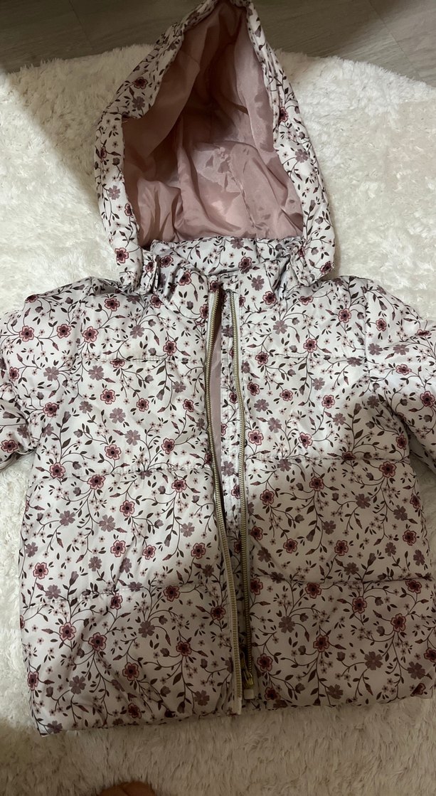 Kız çocukları için fitted kesim, yüksek yakalı, kapüşonunda kürklü, çiçek desenli sokak tarzı mont. Beyaz ve gri tonlarında, sentetik kumaştan yapılmıştır. ❄️