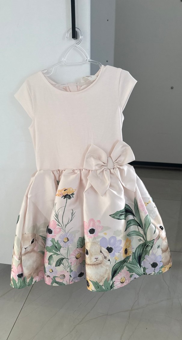 Pamuk kumaş üstü kısa kollu, çiçek ve tavşan desenli pastel renk etekli, fiyonk detaylı, klasik şıklıkta kız çocuk elbisesi. Hiç giyilmedi