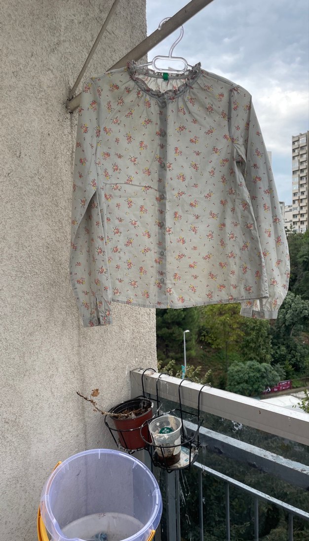 Pamuklu kumaştan yapılmış, uzun kollu ve yuvarlak yakalı kız çocuk çiçekli bluz, düğmeli ve bol kesimdir.