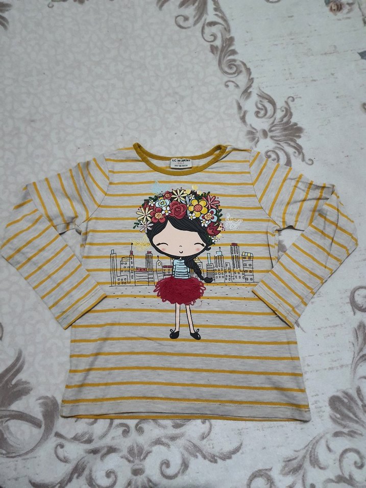 Pamuklu, örme kumaştan, uzun kollu, bisiklet yaka ve çok renkli baskılı, çizgili gri kız çocuk tişörtü.