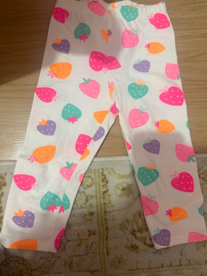 Pamuklu, baskılı, pastel renkli çilek desenli, fitted kesim kız çocuk taytı, sokak modasına uygun.