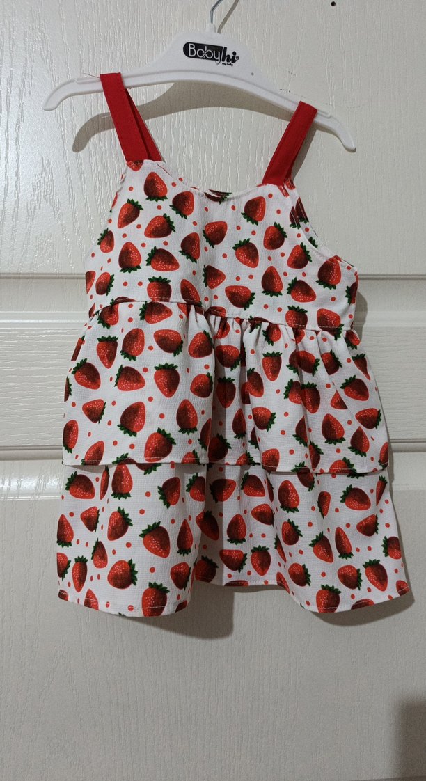 Askılı, beyaz sentetik kumaş üzerine renkli çilek desenli, bol kesim kız çocuk elbisesi. Fırfır detaylı ve kırmızı askılı, günlük kullanıma uygun.