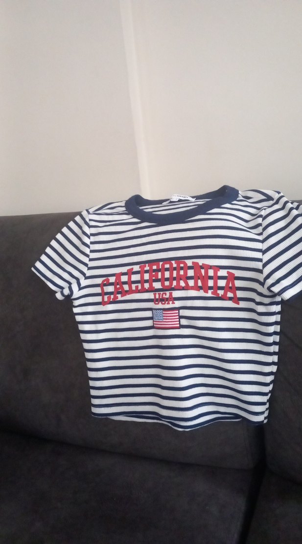 Pamuklu, kısa kollu, bisiklet yaka ve renkli çizgili, California USA baskılı kız çocuk tişörtü. Fitted kesimle rahat kullanım sağlar.