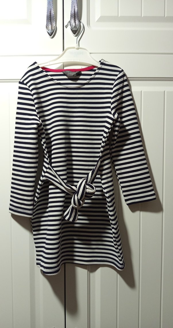 Kız çocuk elbisesi, uzun kollu ve yuvarlak yaka tasarıma sahiptir. Beyaz ve gri çizgili, fit kesim ve bele bağlanan kemer detayı bulunur. Yumuşak sentetik kumaştan üretilmiştir. Avrupa'dan hediye geldi hiç kullanılmadı. sadece etiketini kızım elime alırken söktü.