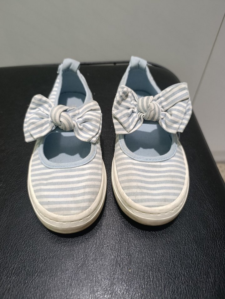 Çizgili desenli ve büyük fiyonk detaylı kız çocuk ilk adım ayakkabısı. Kauçuk tabanlı, gri ve beyaz tonlarında rahat ve günlük sokak stili ayakkabısı.