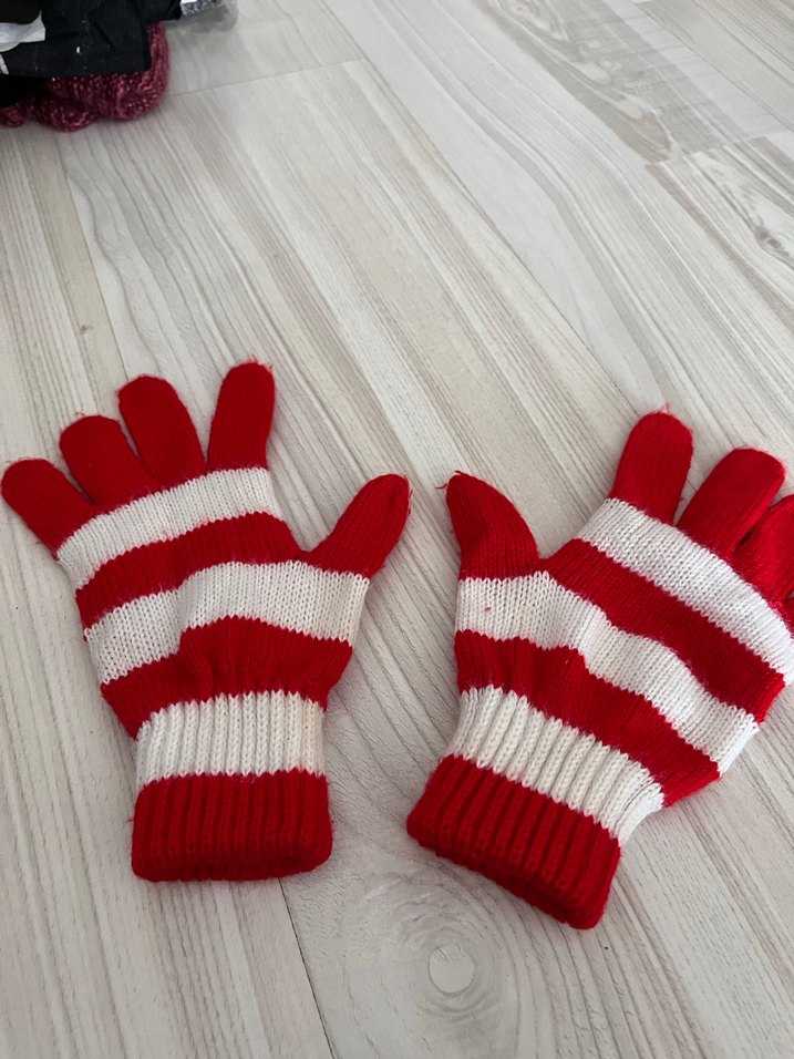 Kırmızı ve beyaz çizgili, yumuşak örme kumaştan kız çocuk eldiveni. Rahat ve renkli, günlük kullanım için uygundur.