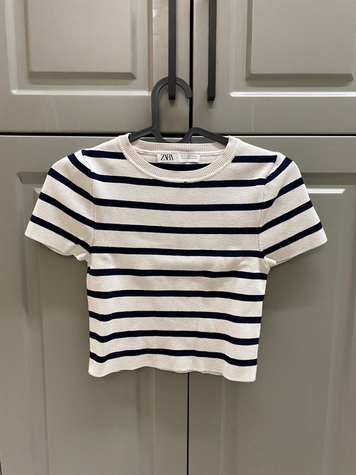 Kısa kollu, bisiklet yaka ve pamuklu örgü kumaştan yapılmış kız çocuk tişörtü. Beyaz zemin üzerine lacivert çizgiler içerir, trend sokak stili için uygundur.