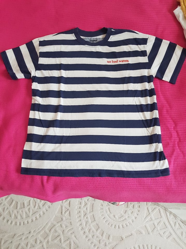 Kısa kollu, bisiklet yaka ve bol kesim kız çocuk tişörtü. Yumuşak pamuktan yapılmış, pastel mavi ve beyaz çizgili, rahat sokak stili. Üzerinde küçük 'no bad waves' yazısı bulunur. hic kullanılmamış