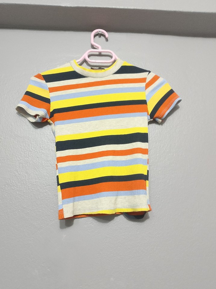 Kısa kollu, bisiklet yaka, renkli çizgili, triko örgü yapısında sentetik kumaştan yapılmış, genç ve şık bir kız çocuk tişörtü.