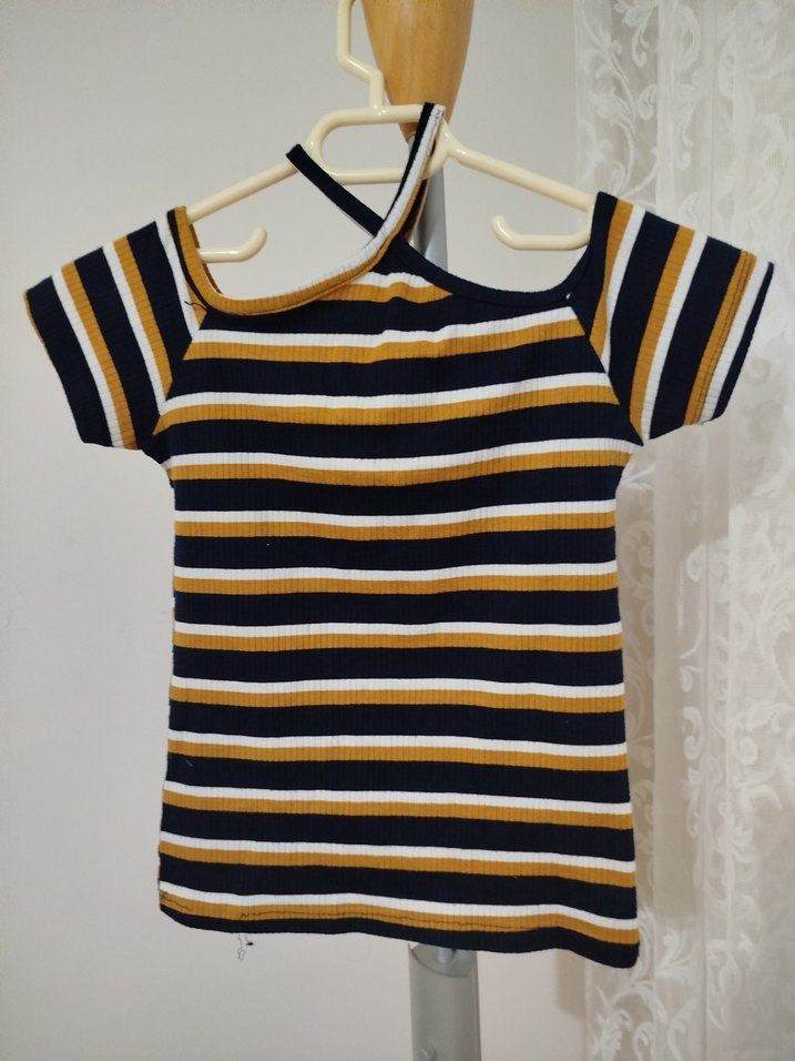 Kısa kollu, tekne yaka, örme kumaştan yapılmış, sarı ve siyah çizgili kız çocuk bluzu. Örme dokusu, rahat ve şık bir sokak stili sunar.