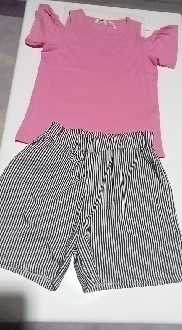 Renkli çizgili ve pileli, sentetik kumaştan üretilmiş, bol kesim kız çocuk şortu. Ve Sıfır omuzu açık kısakollu. İkiside 11-12 yaşa uygun.