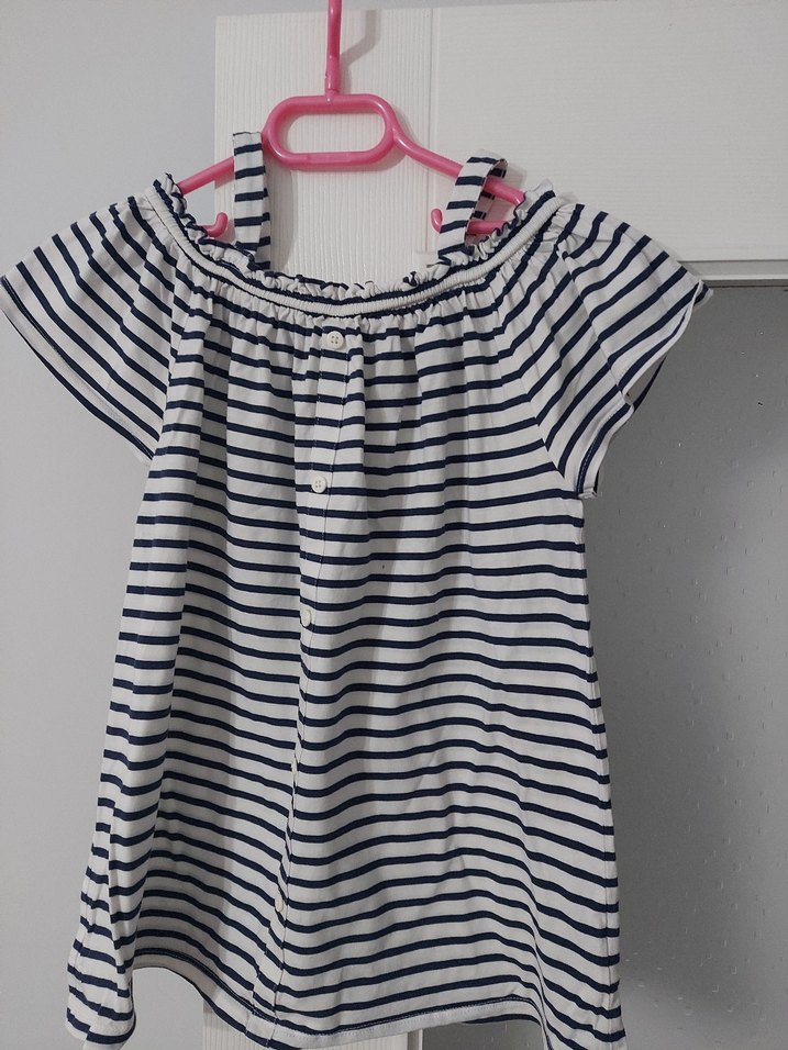 Kız çocuk çizgili elbise, kayık yaka ve kısa kollu. Pliseli ve bol kesimli, gri-beyaz çizgili sentetik kumaştan yapılmıştır.