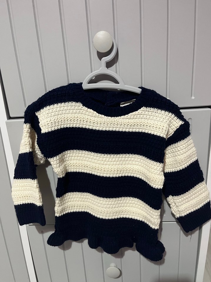 Kız çocuk için uzun kollu, yuvarlak yaka, çizgili ve bol kesim triko kazak. Trendy ve rahat bir görünüm sağlar. 1 defa giyildi bir problemi yok