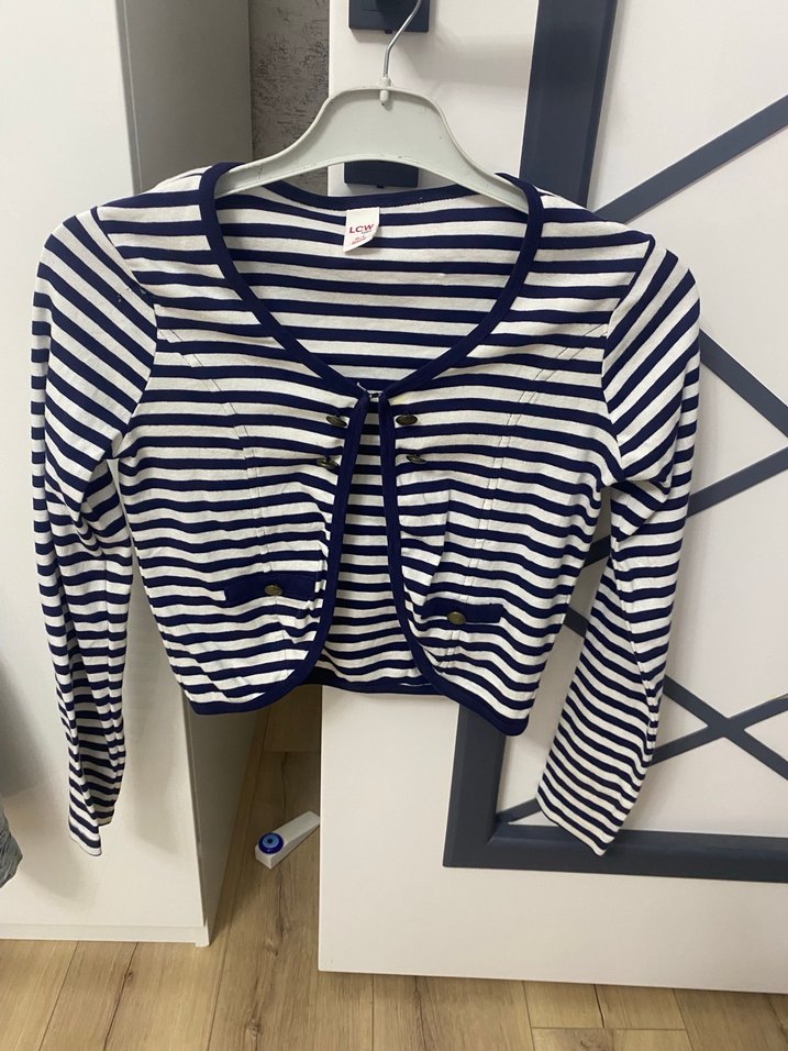 Dar kesim kız çocuk bolero, uzun kollu ve tekne yaka. Düğmeli ön ve lacivert-beyaz çizgili örme kumaştan, trend sokak stili için uygun.
